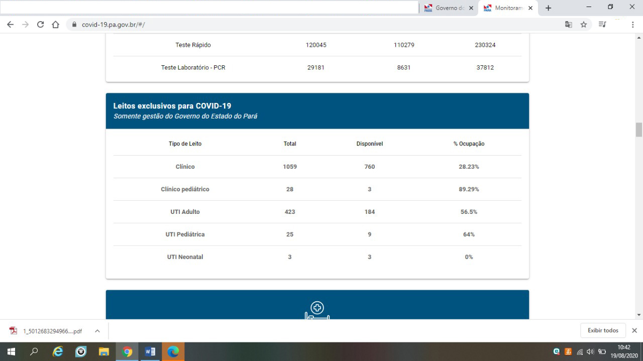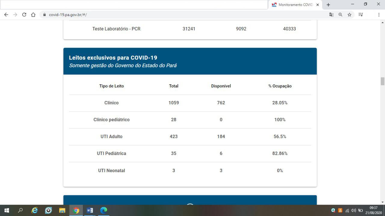 “A Secretaria de Estado de Saúde Pública (Sespa) informa que, nesta terça-feira (25), a taxa de ocupação de leitos pediátricos é de 65,79% para os leitos clínicos pediátricos e de 51,43% de ocupação da UTI pediátrica.