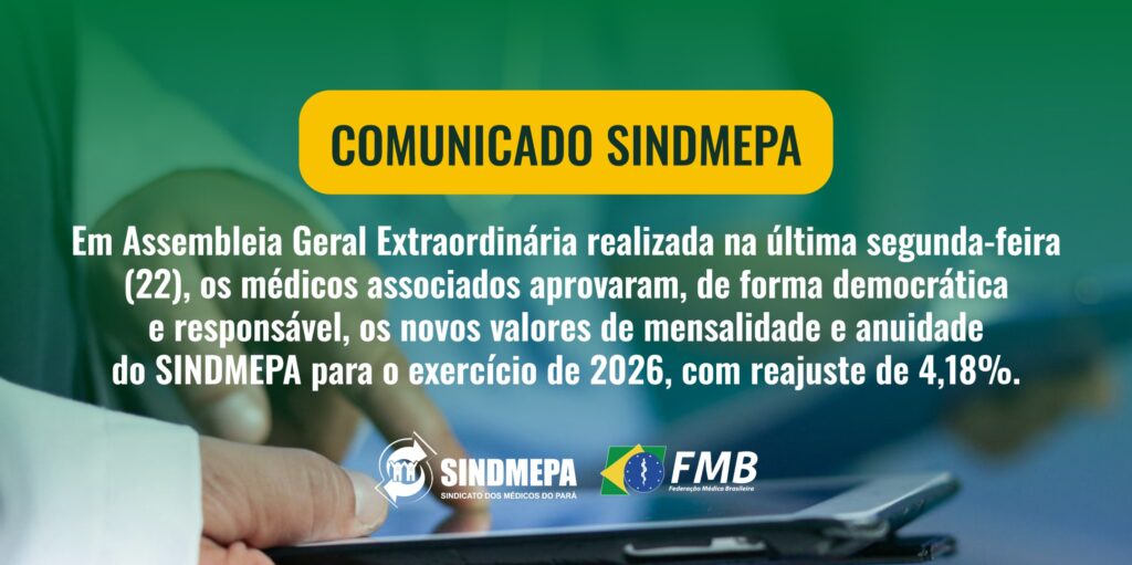Na noite da última segunda-feira (22), foi realizada a Assembleia Geral Extraordinária (AGE), espaço legítimo de escuta, debate e deliberação coletiva. Em um ambiente democrático, construído com respeito e participação dos médicos, foram aprovados os novos valores de mensalidade e anuidade do SINDMEPA para 2026, com reajuste de 4,18%.